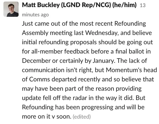 Second, though, we want to ask what has happened to the process announced for developing new democratic structures in Momentum.